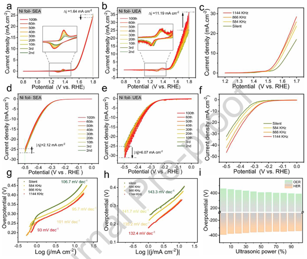 图2 镍箔催化剂的析氧反应循环伏安曲线变化:(a)无超声条件;(b)在脉冲超声(866 khz,125 w,50%振幅)条件,(c)oer 线性扫描伏安曲线。镍箔催化剂的析氢反应cv 曲线变化:(d)无超声条件;(e)超声条件。(f)her 线性扫描伏安曲线。(g)oer 和(h)her 的塔菲尔斜率图。(i)超声条件下,电催化活性随超声功率增加的变化情况。