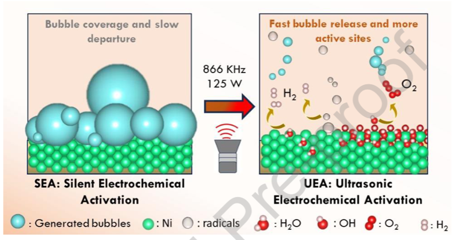 该研究聚焦于超声对镍基催化剂在碱性水分解反应中的影响。作者提出的策略核心在于利用超声的物理和化学效应,加速气泡从催化剂表面的释放,同时促进催化剂表面的活性位点再生,从而提升整体的电催化性能。