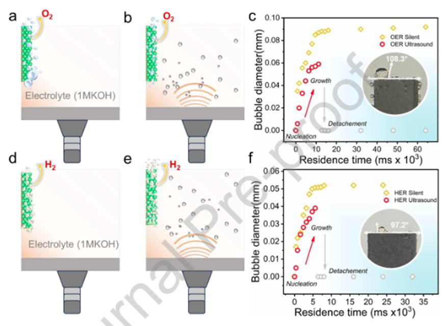 图1 示意图展示了在(a, d)无超声、(b, e)超声辐照下析氧反应和析氢反应的半电池构型反应,以及(c, f)镍箔电极上气泡直径随时间的演变情况(插图显示电极与气泡粘附的接触角)