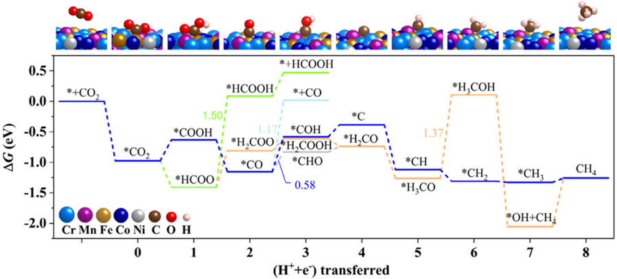 五种金属协同调控电子结构,强力吸附co₂和氢气,降低反应能垒,精准生成甲烷而非副产物。