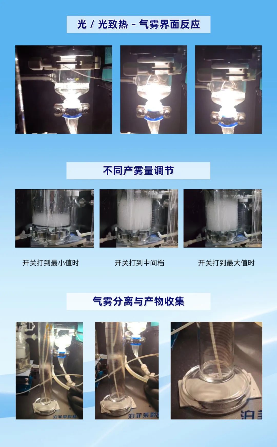 控制单元主要控制mfc流速及雾化器雾量,雾化量可调节,全部操作均在电容屏幕上进行;屏幕可灵活旋转,操作简便。内置甲烷传感器,气体泄漏时及时报警和切断气路,确保使用安全;气路单元用于控制三路(ch₄、o₂、ar)气体流速与流量;雾化单元采用多头超声雾化方式,确保液滴粒径足够小,雾化量足够大。雾化室预留补水口,可通过针筒补水,雾化头为消耗品;反应单元中反应器采用分体式结构,上腔室和下腔室中间将催化剂膜层(载体为石英纤维滤膜)夹紧,以保证气体及水雾完全通过催化剂床层。气液分离器用于产物分离与收集。