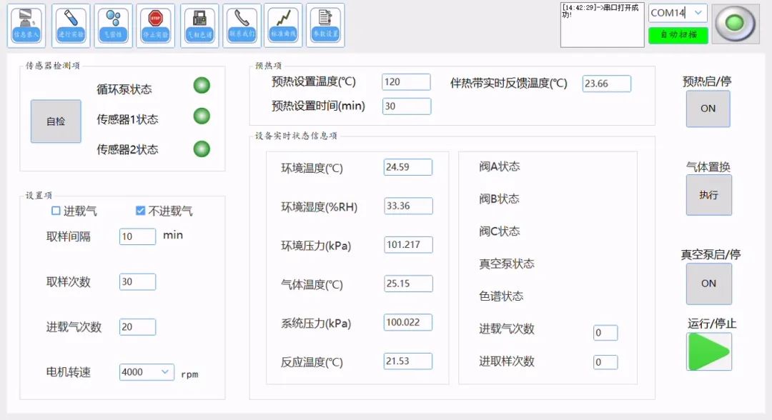 2)打开 μgas1000 电源开关,等待1-2 min后打开 μgas1000 软件,点击“进行试验”界面,右上角选择 μgas1000 仪器串口